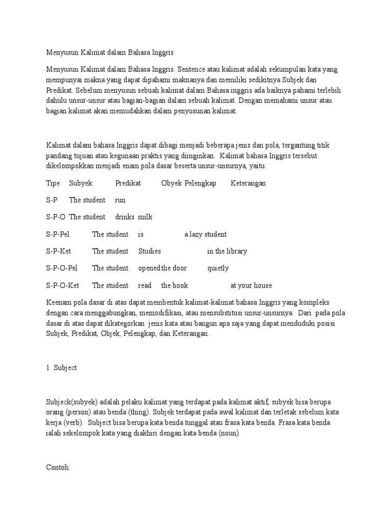 Pola Kalimat Bahasa Inggris Subject Verb Object Predicate Noun Pro